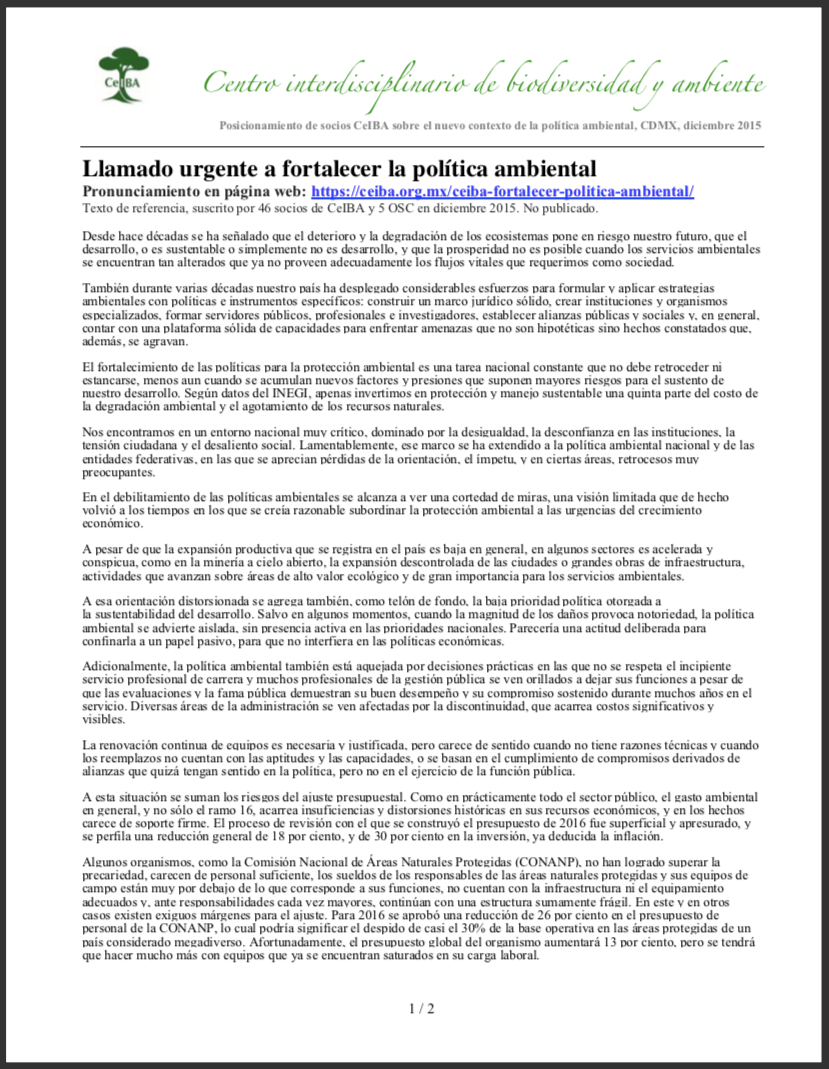 CeIBA expresa su preocupación y alerta sobre las medidas regresivas adoptadas por el Ejecutivo Federal y propuestas por el Congreso de la Unión que debilitan la institucionalidad del sector ambiental federal y desconocen el sistema jurídico internacional e interno para la protección del medio ambiente y el desarrollo sustentable