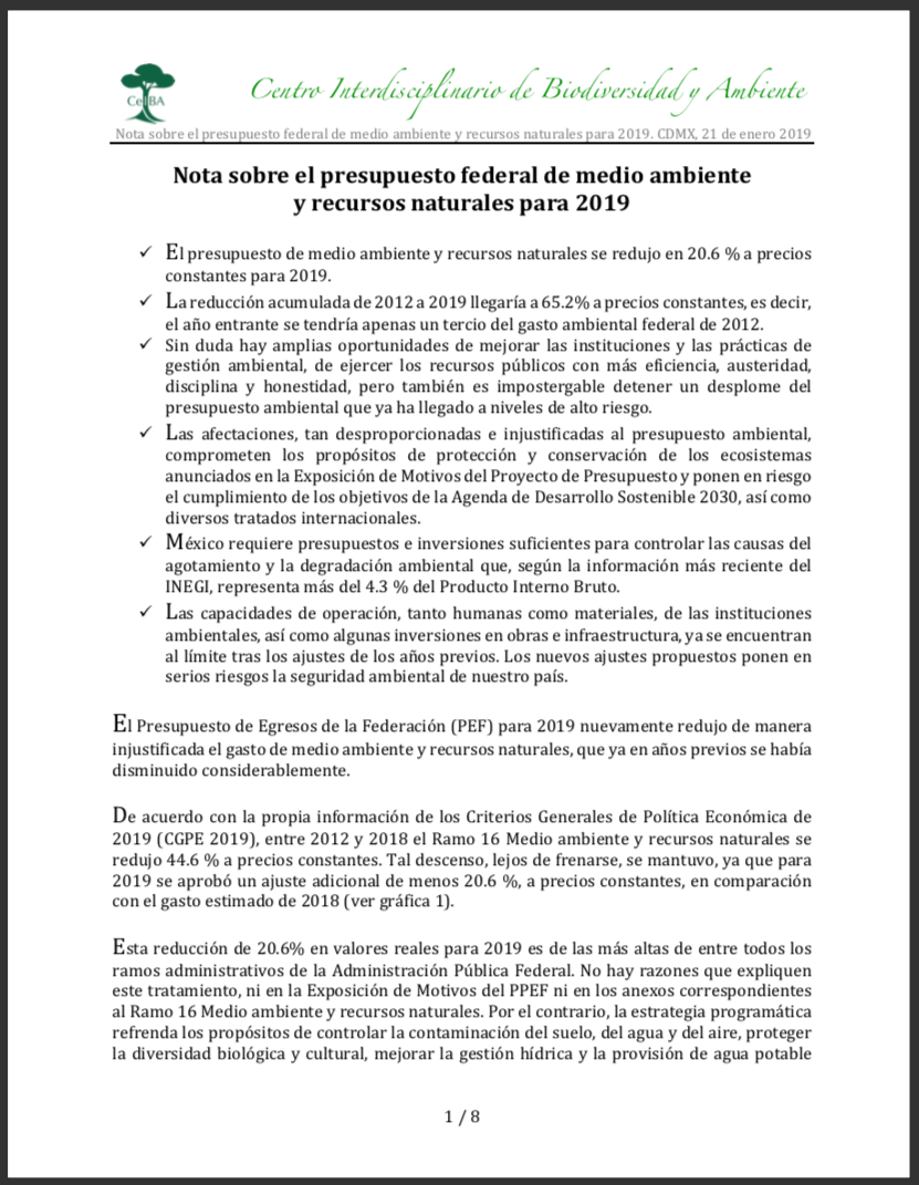 Enero 2018 Nota analítica sobre el presupuesto 2019 para medio ambiente y recursos naturales |