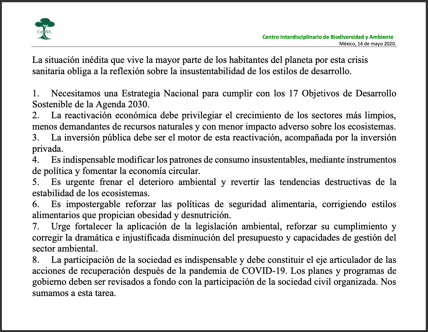 El Centro Interdisciplinario de Biodiversidad y Ambiente (CeIBA A.C) es una Asociación Civil sin fines de lucro, dedicada al análisis de los problemas relacionados con el medio ambiente y el bienestar humano, que mantiene un diálogo con todos los actores de la sociedad y promueve lineamientos de política ambiental y para la sustentabilidad del desarrollo.